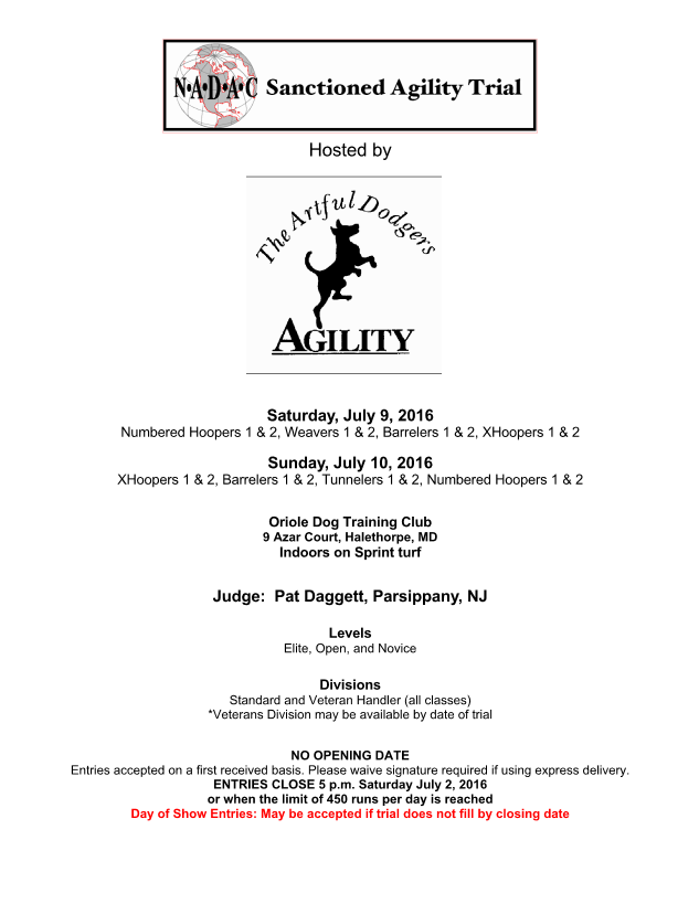 Entries are open now for a new Oriole/Artful Dodger’s NADAC Agility trial held at the Oriole Dog Training Club training facility. This trial is limited to 450 runs. The particulars for this trial, along with a link to the premium list, can be found on the Oriole NADAC Agility Trial Information page.