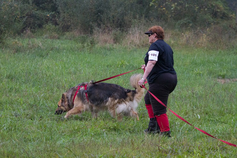 Diana Reich and her German Shepherd Barkley, heading to the start flag to earn his TD. This photo was taken at the German Shepherd Tracking Test held in fall 2013 at Fair Hill, MD. Diane Reich is an Oriole member; Nancy Skinner, an Oriole member, was the Chief Tracklayer, and a number of Oriole students and instructors were there as working volunteers. As is the case in the local tracking community, members of the German Shepherd Club came to help with the 2014 Oriole Tracking Test also at Fair Hill.