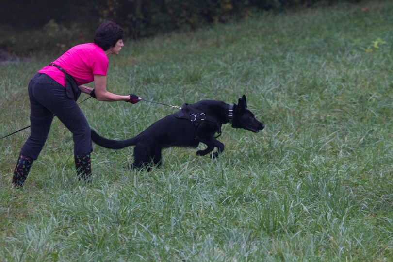 Donna Murray and her Black German Shepherd Laelia, eager to take off at the start flag to earn her TD. This photo was taken at the German Shepherd Tracking Test held in fall 2013 at Fair Hill, MD. Diane Reich is an Oriole member; Nancy Skinner, an Oriole member, was the Chief Tracklayer, and a number of Oriole students and instructors were there as working volunteers. As is the case in the local tracking community, members of the German Shepherd Club came to help with the 2014 Oriole Tracking Test also at Fair Hill.