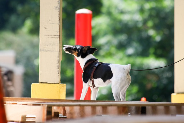 Betty Gardner and Smooth Fox Terrier Caijan narrowing in on the target odor during an exterior search at the Canine Copilots K9 Nose Work trial held in June at the Roland Park Country School. Photo credit to Canine Copilots LLC Photography (http://caninecopilots.smugmug.com/).