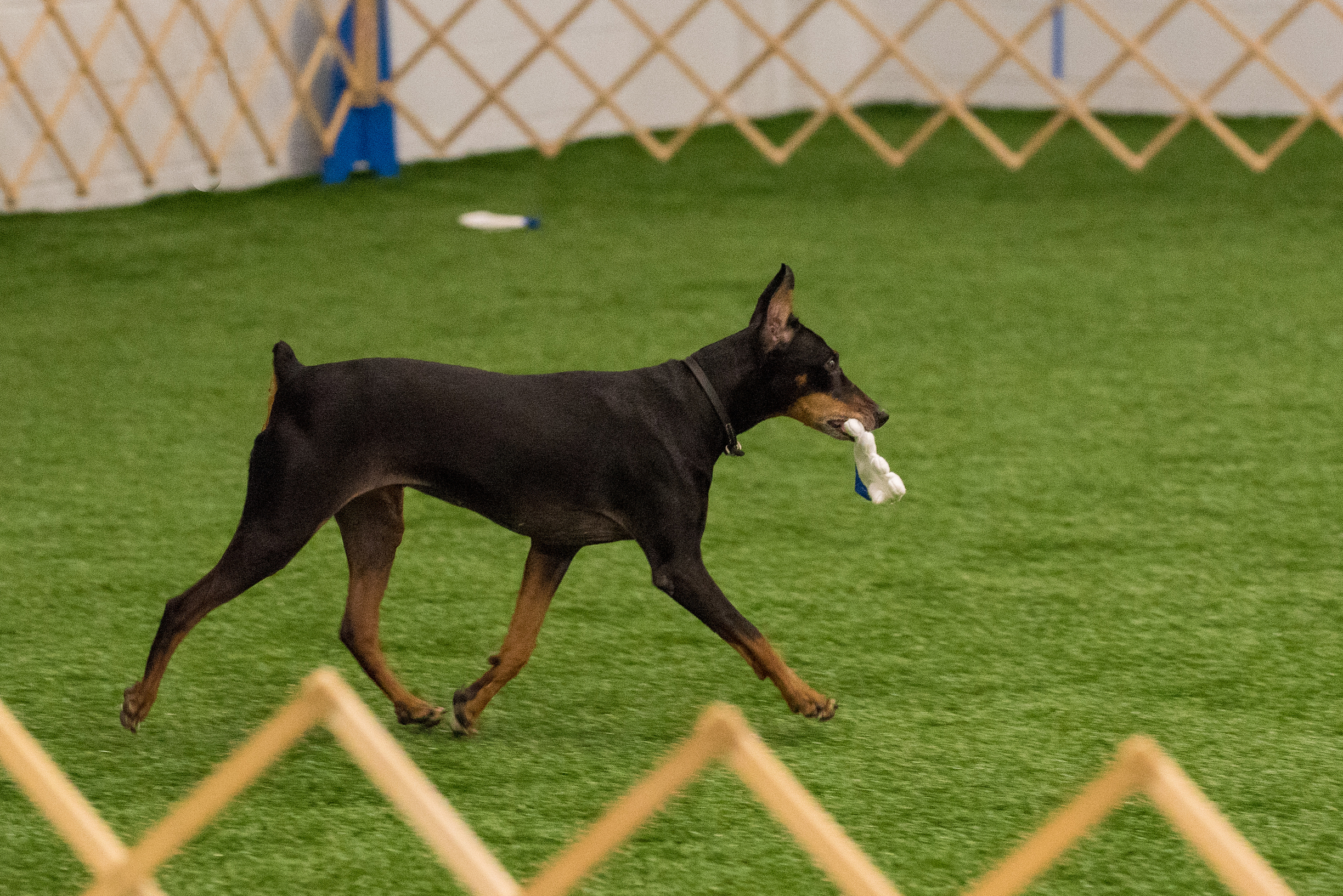 German Pinscher “Indy” correctly fetches the indicated glove from a line of identical gloves for her owner Debbie Kaminski. Indy went on to successfully complete all the remaining tasks to secure her Utility Dog (UD) title at the May 2015 Oriole AKC Obedience Trial. Photo credit to Carl Gernazio.