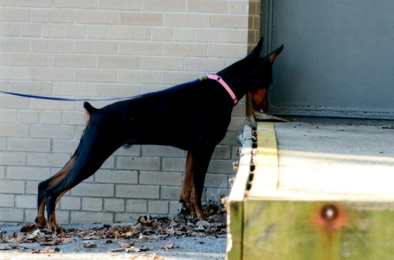 Thaler, a Doberman owned by Don and Linda Grskovich indicates a ‘hide’ during an exterior search off a loading dock during a K9 Nose Work trial.